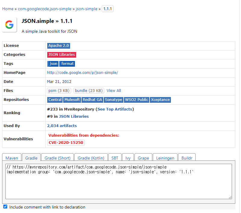 implementation group: 'com.googlecode.json-simple', name: 'json-simple', version: '1.1.1'